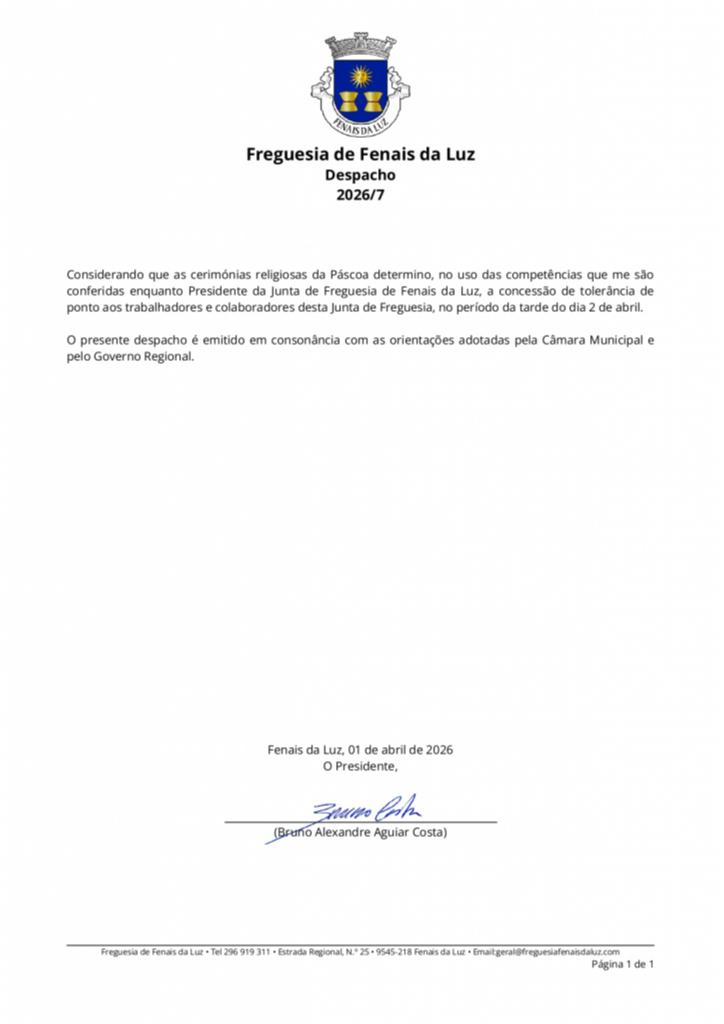 Considerando que as cerimónias religiosas da Páscoa, em consonância com as orientações adotadas pela Câmara Municipal e pelo Governo Regional, o Presidente da Junta de Freguesia determina a concessão de tolerância de ponto aos trabalhadores e colaboradores desta Junta de Freguesia, no período da tarde do dia 2 de abril.
